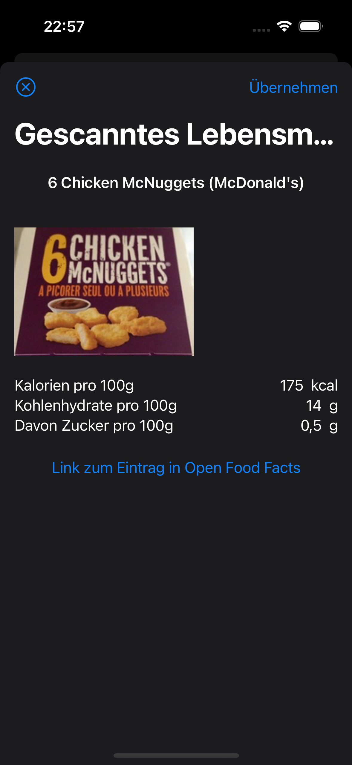 Derzeit ist nur eine Lebensmitteldatenbank angebunden, nämlich OpenFoodFacts. OpenFoodFacts ist eine offene Lebensmitteldatenbank, d.h. jeder kann beitragen. Das bedeutet, dass dort auch falsche Nährwerte eingetragen sein können. Überprüfen Sie daher bitte immer, ob die in der Datenbank gefundenen Nährwerte auch den tatsächlichen Nährwerten entsprechen. Nutzen Sie hierzu das Detailanzeigefenster, wo Sie auch Produktbilder finden, in die Sie hineinzoomen können.